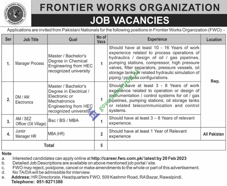 Frontier Works Organization FWO Jobs 2023 – Apply Online Salary Offer: 50,000+ Education: Master, Bachelor Vacancies: Multiple Newspapers : Address HR …